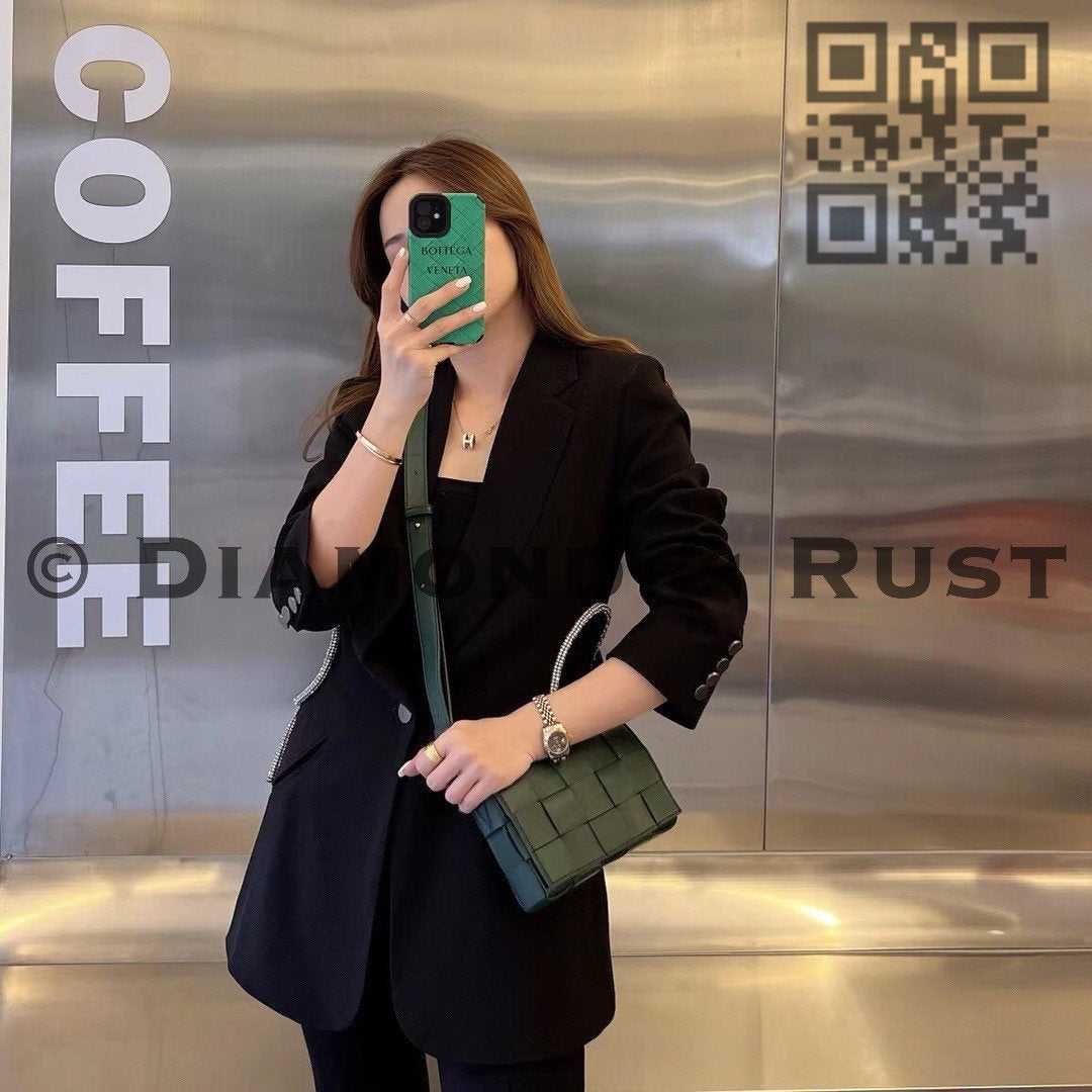 The bag comes with dust bag, it does not come with box. Full grain leather Triangle Buckle adjustable shoulder Strap Hardware: Gold /Silver Finish 19cm x 12cm x 4cm