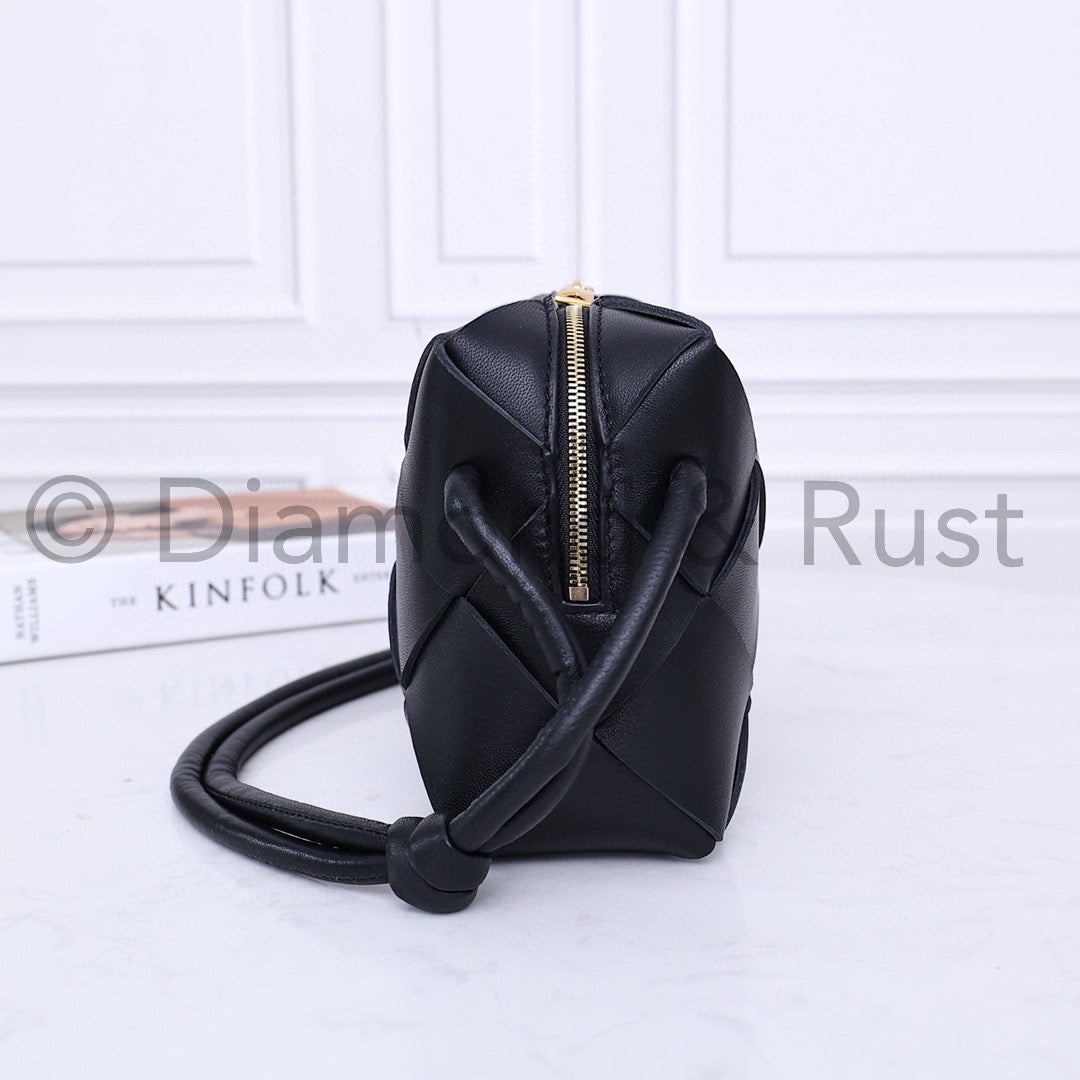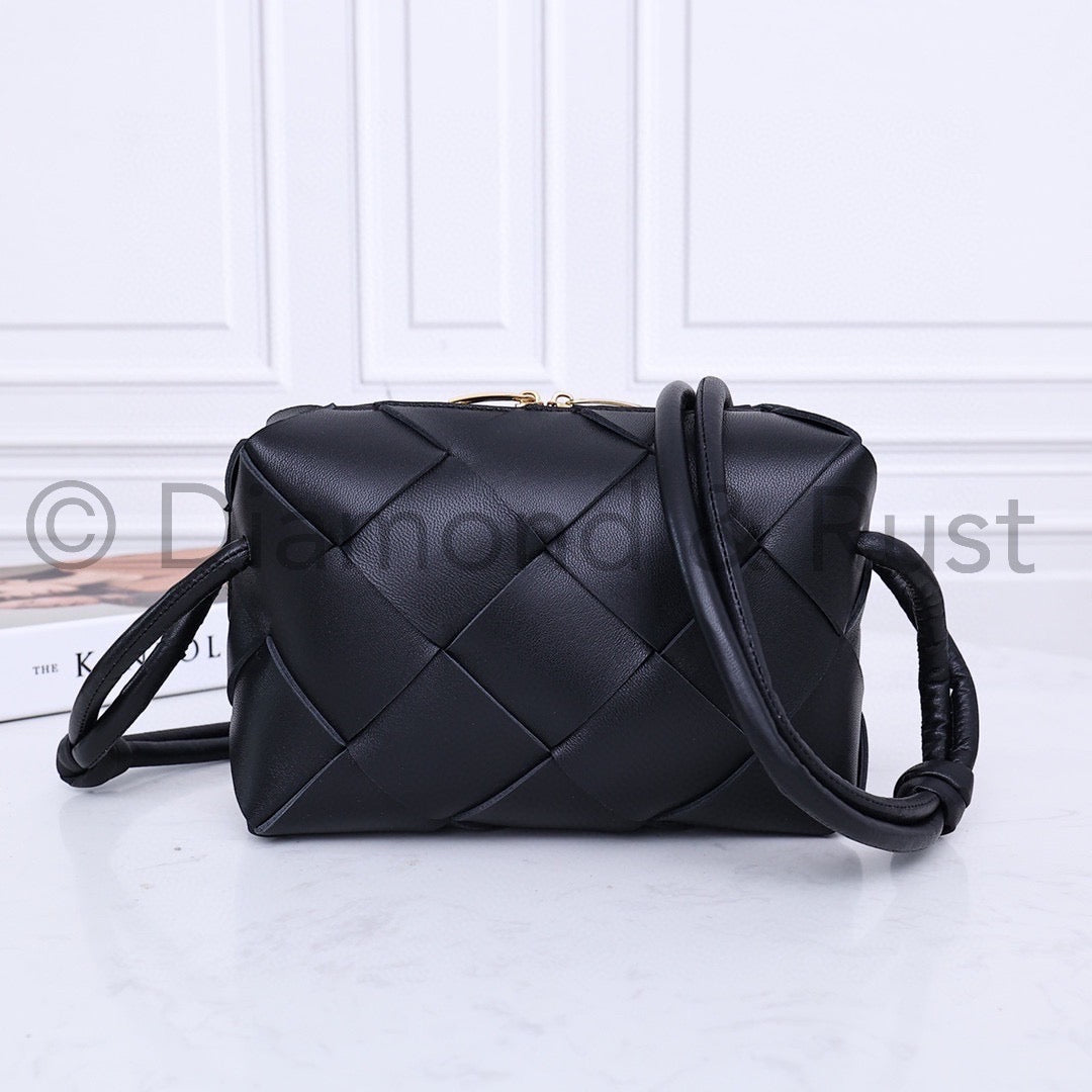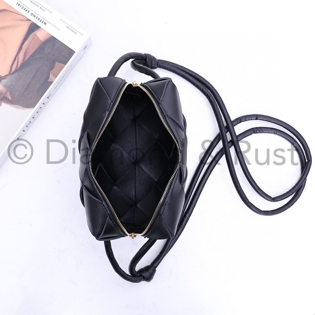 DUST BAG INCLUDED NOT BOX• Interwoven leather cross-body bag• Zipper Closure• Light weightMaterial: Laminated Lamb Leather• Height: 14.5cm• Width: 22cm• Depth: 7.5cm• Strap drop: 55cm Adjustable