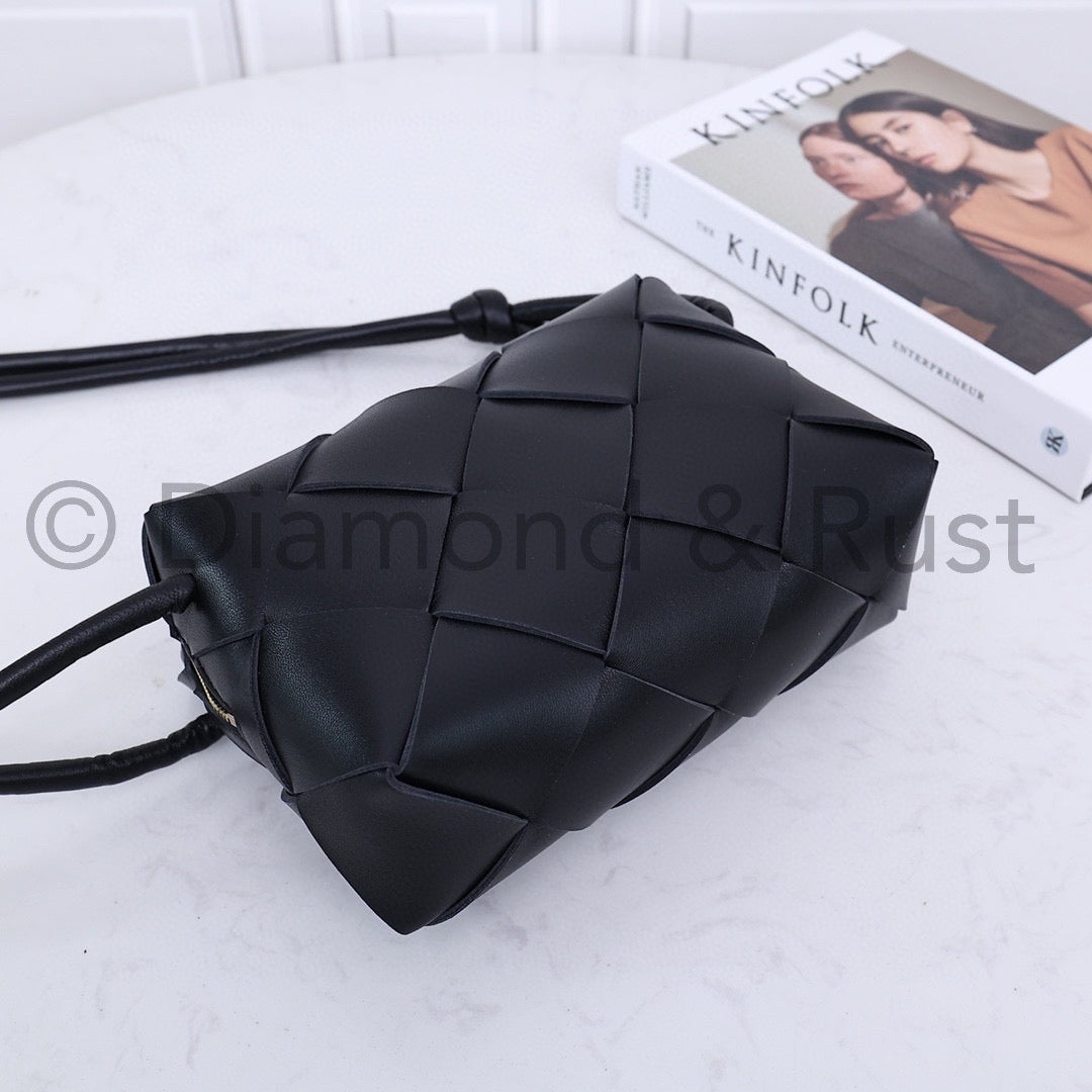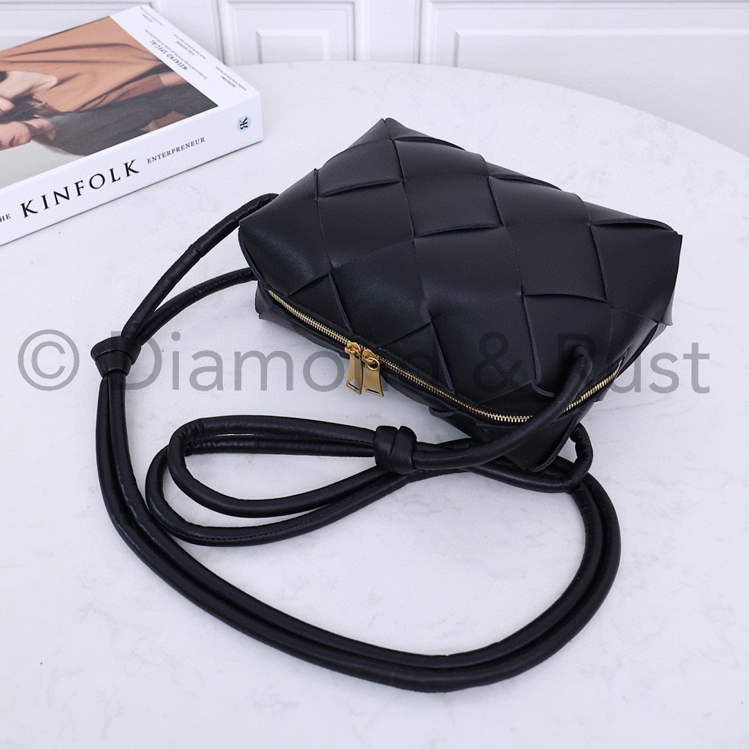 DUST BAG INCLUDED NOT BOX• Interwoven leather cross-body bag• Zipper Closure• Light weightMaterial: Laminated Lamb Leather• Height: 14.5cm• Width: 22cm• Depth: 7.5cm• Strap drop: 55cm Adjustable